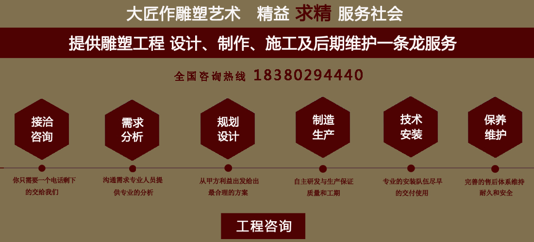成都大匠作雕塑有限公司,是經(jīng)成都工商局審定注冊(cè)的正規(guī)專業(yè)雕塑制作及工程安裝服務(wù)機(jī)構(gòu),是由一群年輕富有朝氣的年輕人創(chuàng)辦,發(fā)軔于四川省成都市龍泉驛區(qū)。它是一家******于創(chuàng)作、制作和銷售為一體的公司。大匠作擁有多年從事公共藝術(shù)的專業(yè)人員和雕塑制作人組成的核心團(tuán)隊(duì),為您提供專業(yè)、具創(chuàng)新的設(shè)計(jì)及制作服務(wù)。公司成立以來,秉承“******服務(wù)、誠信為本”的宗旨,以客戶需求為目標(biāo)導(dǎo)向,不斷學(xué)習(xí),進(jìn)取,優(yōu)化和提高服務(wù)質(zhì)量,公司向您******——“您的滿意***是我們的信譽(yù)”,我們將以飽滿的熱情和******的服務(wù)贏得您的贊譽(yù)和支持。